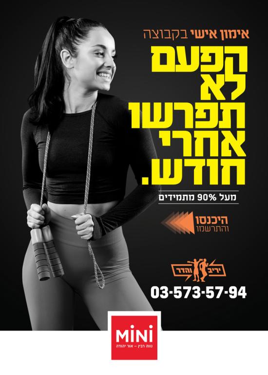 מוצר: חדר כושר    קופי: הפעם לא תפרשו אחרי חודש    קונספט: שילוט חוצות - חדר כושר הנותן אימון אישי בקבוצה, ניצול החסרון הגדול של חדרי הכושר הגדולים והפיכתו ליתרון אצל הלקוח