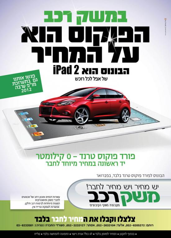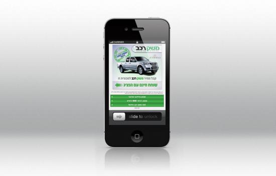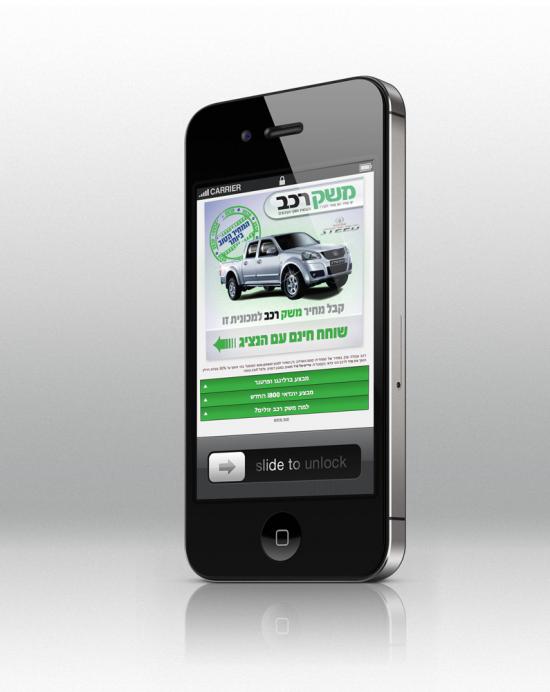 משק רכב - ליסינג לרכב מוצר: אתר סלולרי משק רכב - ליסינג לרכב מוצר: אתר- עמודי נחיתה לסלולאר קונספט: צלצל ישירות לסוכן דרך הסלולאר משק רכב - ליסינג לרכב מוצר: מודעה קופי: הפוקוס על המחיר קונספט: מודעת מכירה לפורד פוקוס, קנה פורד פוקוס קבל IPad משק רכב - ליסינג לרכב מוצר: מודעה קופי: העוצמה במחיר קונספט: רכישת רכב דרך מועדון החברים של משק רכב הינה הזולה ביותר עבור הלקוח משק רכב - ליסינג לרכב מוצר: דף נחיתה קופי: אתה מקבל מחיר של חבר משק רכב - ליסינג לרכב מוצר: חידוש מיתוג